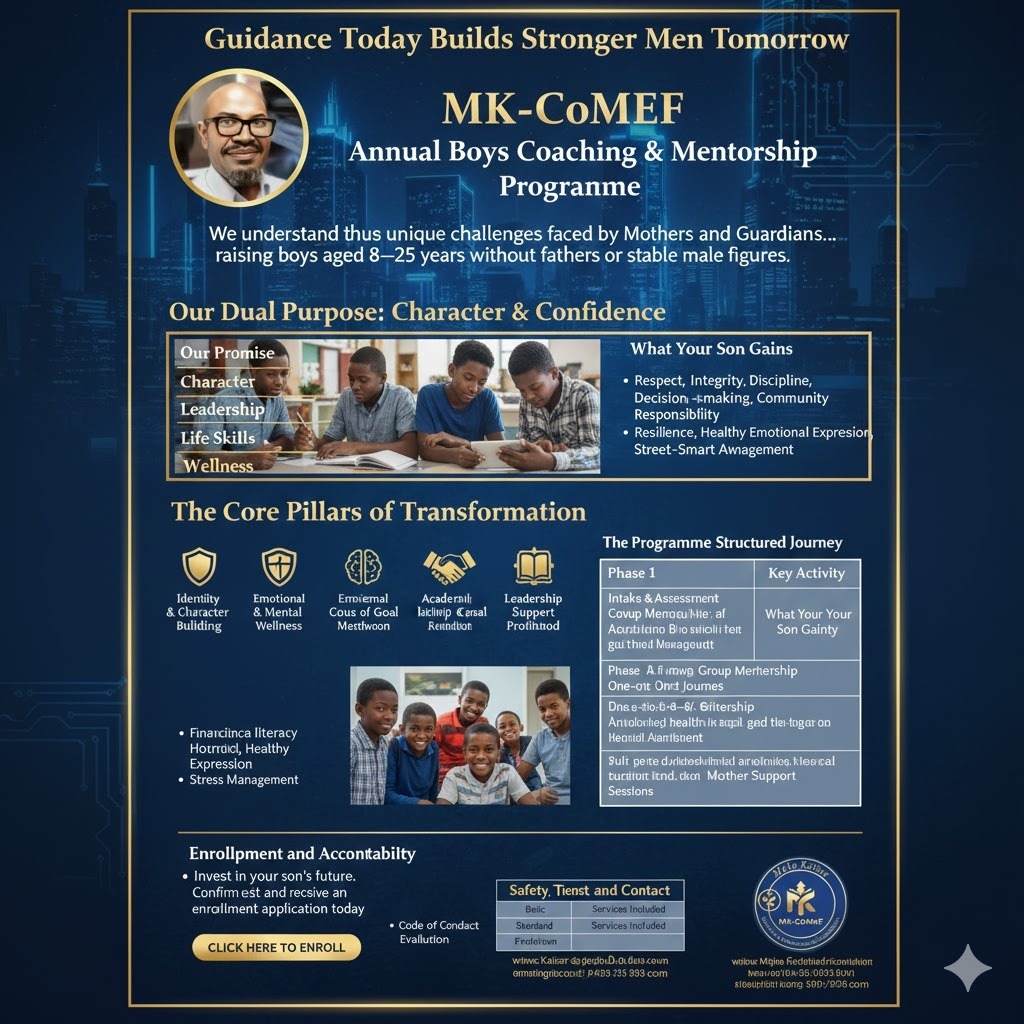 We understand the unique challenges faced by Mothers and Guardians raising boys aged 8–25 years without fathers or stable male figures. The MK-CoMeF Programme is led by seasoned community leader and mentor, Coach Mpho G.D. Kaiser, to fill this crucial gap, providing positive male role models, structure, and values-based training.